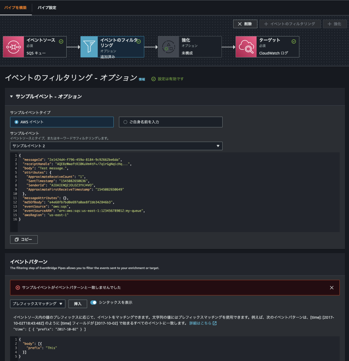 これまでだとフィルタや加工が必要な場合は Amazon EventBridge と AWS Lambda を組み合わせたりする必要があった操作があっという間に完了していまいました。(なにこれすごい)