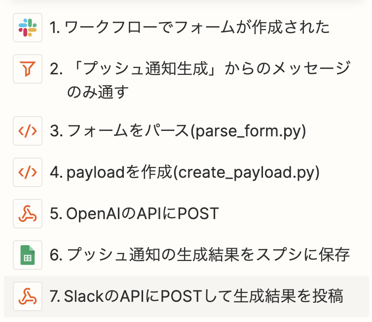 1.の投稿内容をPythonでパースし、それを元に作成したペイロードをOpenAIへのAPIエンドポイントPOSTし、プッシュ通知の生成結果を取得します。 - 2.のZap内で生成結果をSlackに投稿し、Google スプレッドシートに保存します。