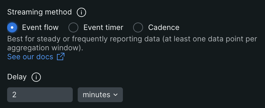 ここからが今回の記事の本題になります。 Streaming methodは、データをストリーミングして集計、判定を行う方法についての定義になります。一見リアルタイムで流れてくるStreaming dataを溜めて閾値判定してるだけのように見えますが、applicationでの実際にログ出力が行われてからNew Relicに到達するまでのタイムラグや、applicationの障害時にログがNew Relic側に送られないといったケースなども考慮された処理方法が提供されています。