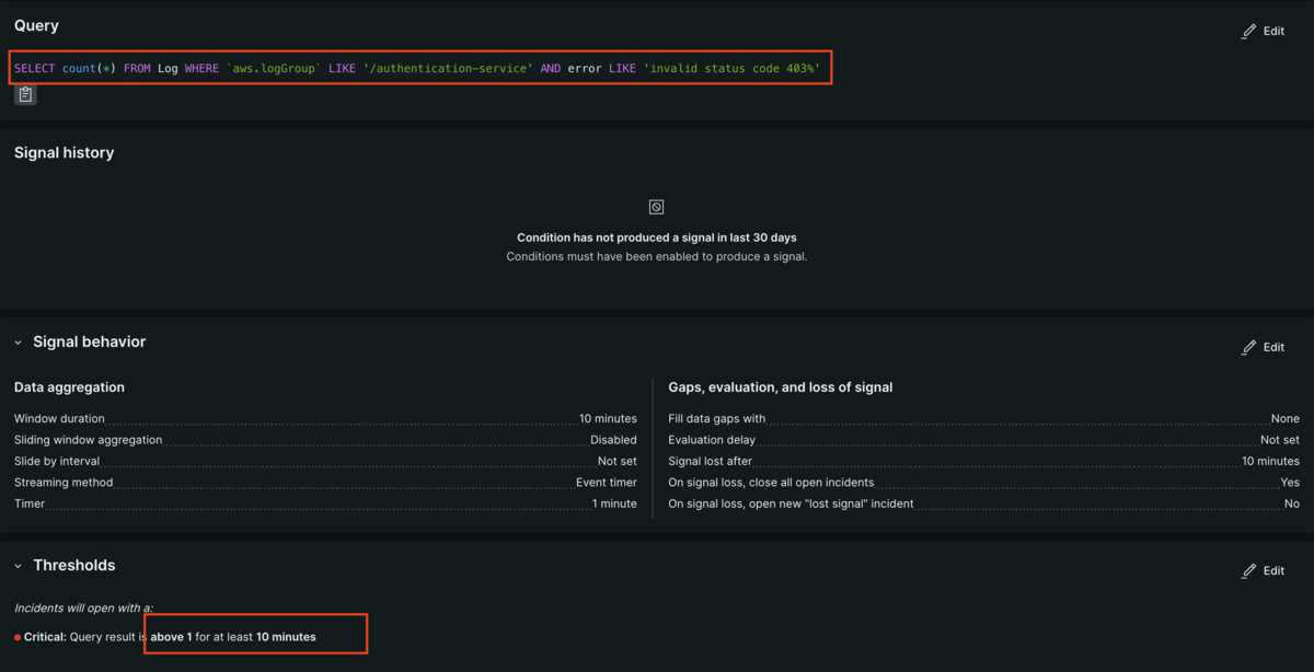 Alert conditionではアラートをトリガーするためのルールや基準を設定します。NRQL(New Relic Query Language)を使用して条件にマッチしたEventデータに対して集計を行い、定義した閾値を超えていればアラートを出す等の設定が可能です。例えば以下のAlert conditionは特定の認証サービスで10分間で「invalid status code 403」を含むエラーログが1件以上あればアラートを通知する、といった設定になります。