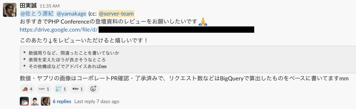 ちなみにサーバーチームメンバーのCfP採択は結構久しぶりな感じで*3、出せる情報出せない情報の社内調整をしたり資料のレビューをもらったりして良い経験になりました。