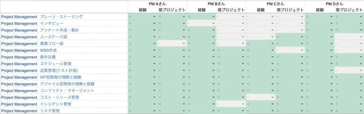 実際にお互いのスキルを共有してみると同じPM職種でもこれまでのキャリアで経験してきたこと、 同じ社内でもプロジェクトが異なると使用しているスキルが異なることが明らかになりました。